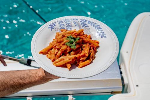 Il pranzo viene servito a bordo e comprende un aperitivo con prodotti tipici locali; a seguire un primo piatto di pesce fresco preparato secondo le ricette della cucina tradizionale sarda, accompagnato da vino Vermentino, birra, frutta fresca, dolci sardi e mirto.