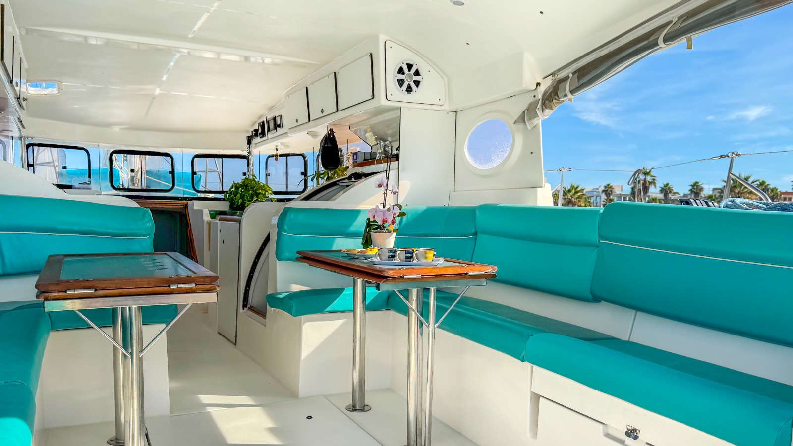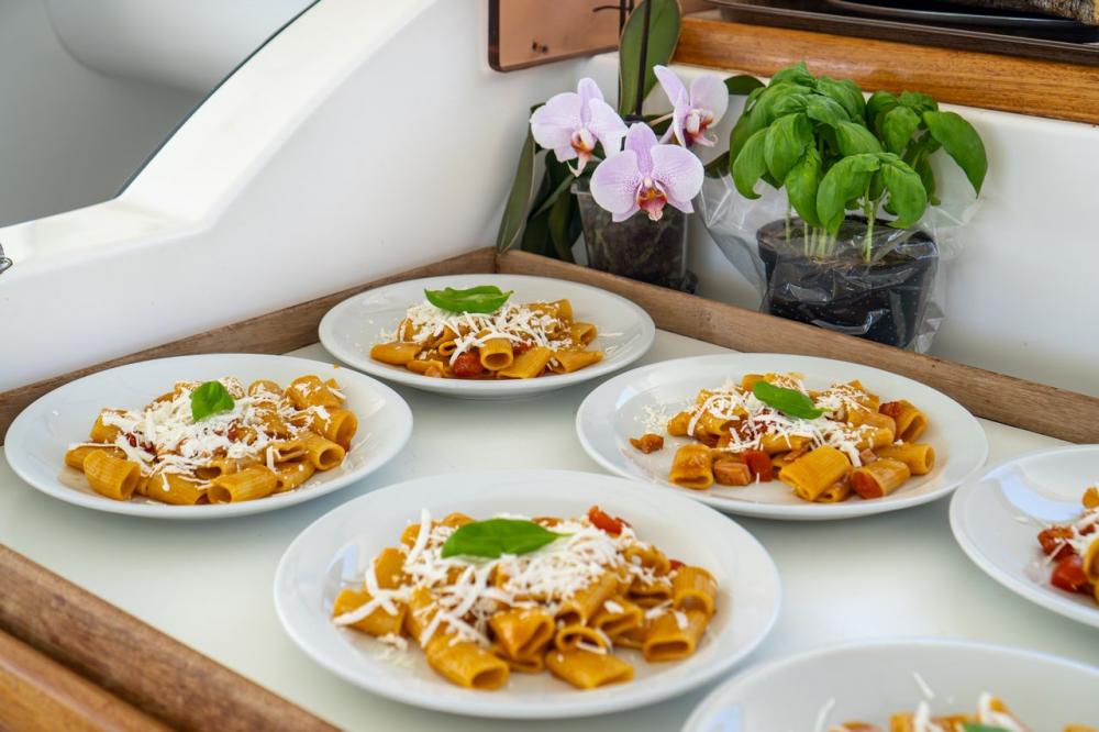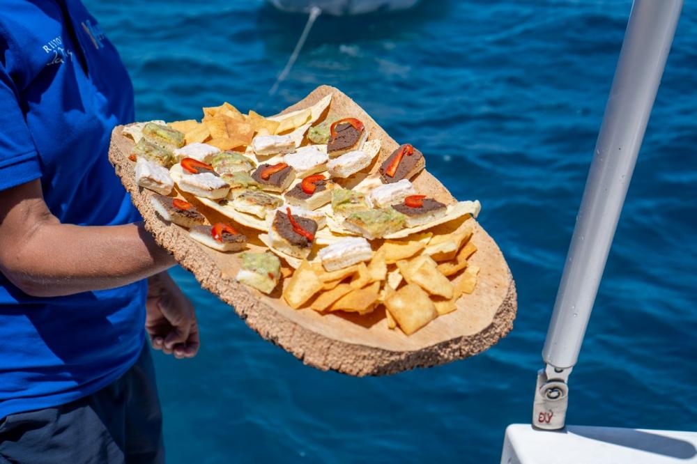 Il pranzo viene servito a bordo e comprende un aperitivo con prodotti tipici sardi; a seguire pasta a base di pesce preparata secondo le ricette della tradizione locale, accompagnata da vino Vermentino, birra, frutta fresca, dolci sardi e mirto.