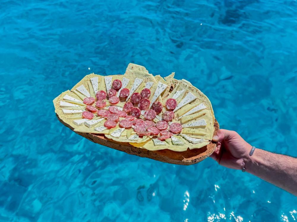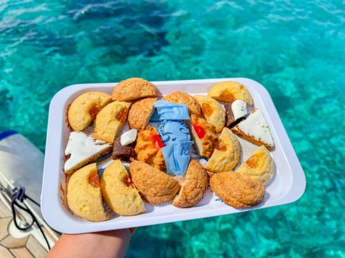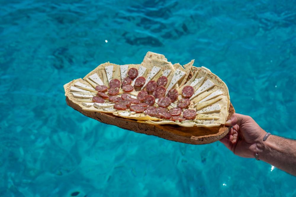 Il pranzo viene servito a bordo e comprende un aperitivo con prodotti tipici sardi; a seguire pasta al pesce preparata secondo le ricette della cucina tradizionale, accompagnata da vino Vermentino, birra, bibite analcoliche, acqua, frutta fresca, dolci sardi e mirto.