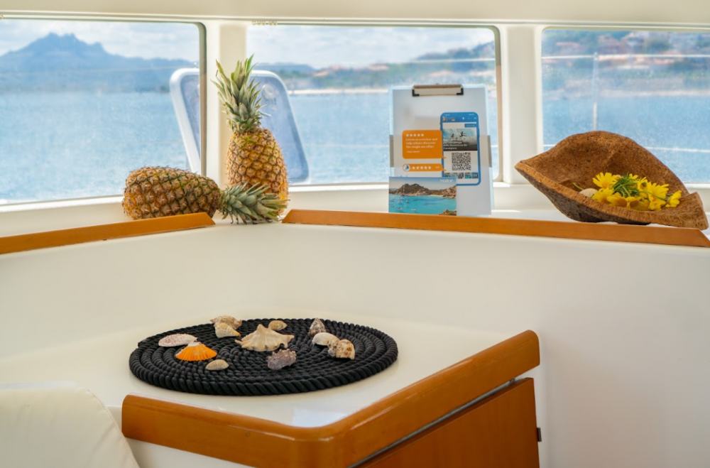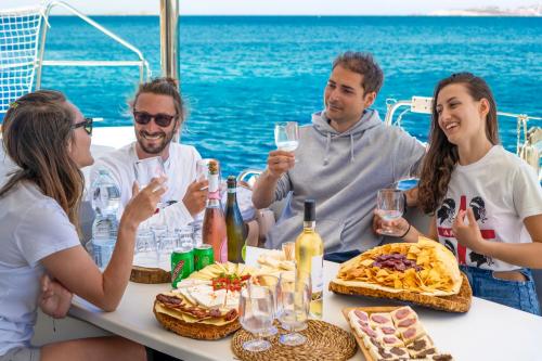 Il pranzo sarà servito a bordo e comprende un aperitivo con prodotti tipici sardi. A seguire, pasta a base di pesce preparata al momento secondo le ricette della tradizione locale. Sono inclusi vino Vermentino, birra, frutta fresca, dolci sardi e mirto, il tipico liquore ottenuto dalla vegetazione mediterranea dell’Arcipelago.
